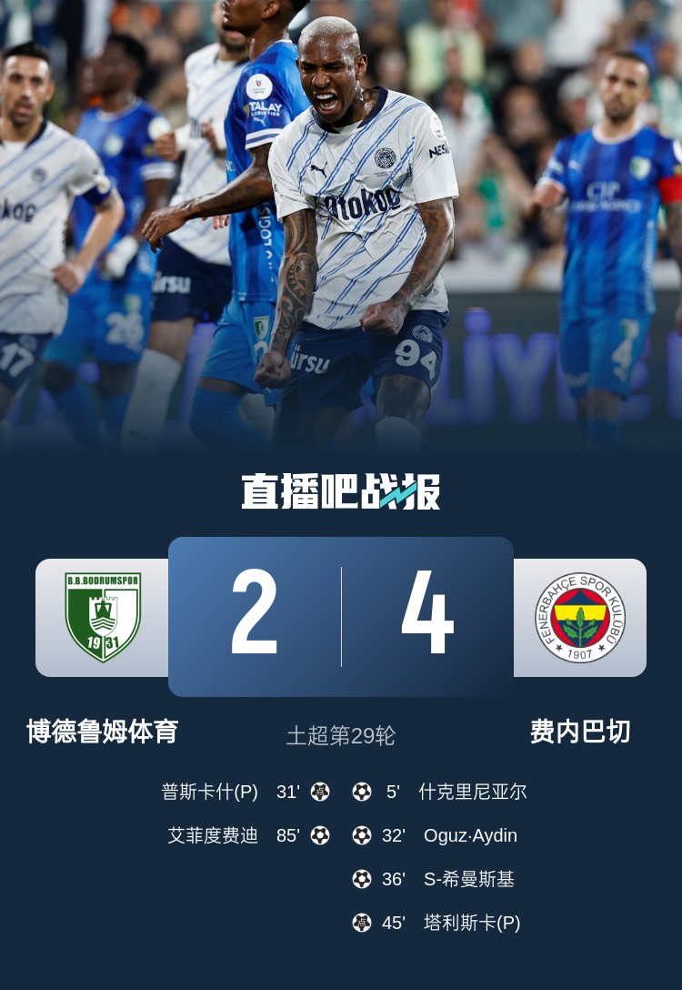 费内巴切本轮4-2击败博德鲁姆体育,费内巴切上半场就多点开花,比赛最终费内巴切4-2取胜。