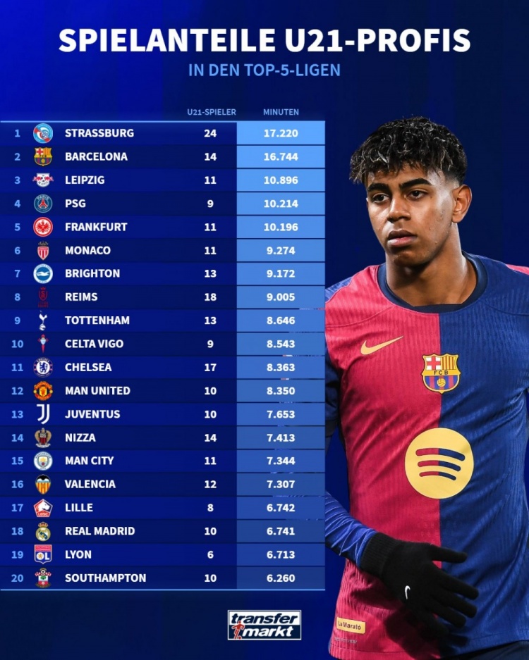 2025-03-29 20:51:56五大联赛球队U21出场时间榜:斯特拉斯堡居首,巴萨第二&巴黎第四