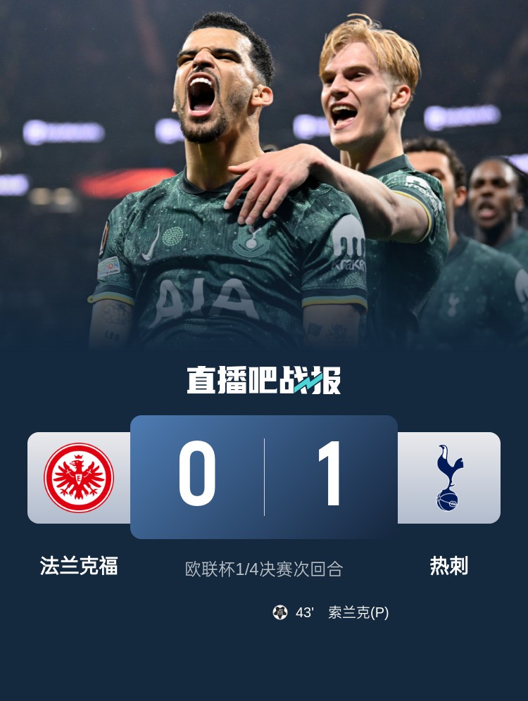 索兰克点射建功,最终热刺1-0客胜法兰克福,总比分2-1晋级四强。
