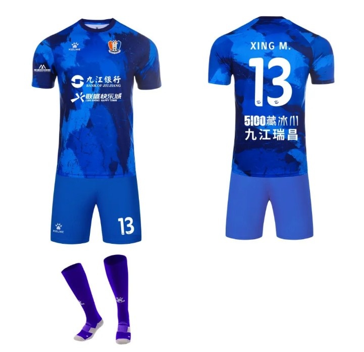 第一客场战袍采用沉稳大气的深蓝色,彰显球队沉稳冷静、从容不迫的气质。以浩瀚星空为灵感,将深邃的蓝色作为主色调,象征着江西庐山足球俱乐部胸怀远大理想,在绿茵场上追逐梦想,永不言弃的精神。