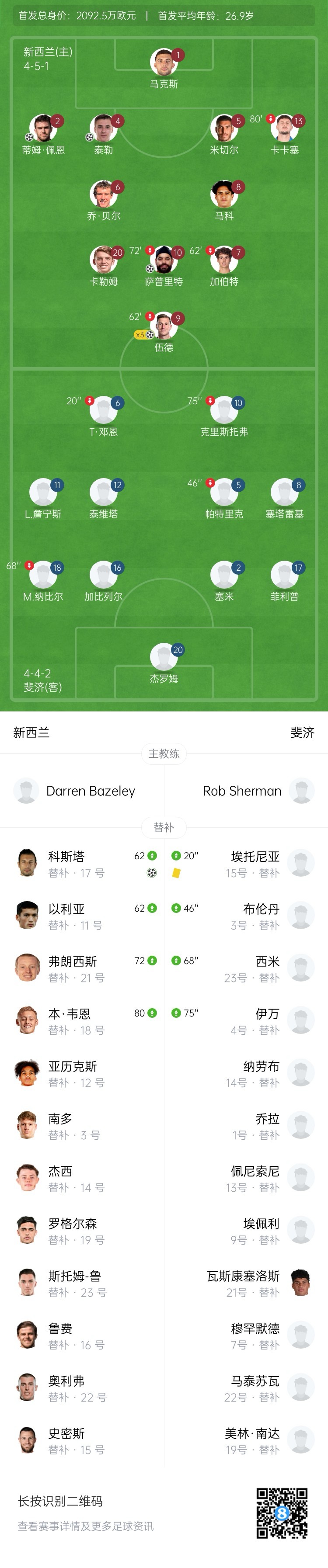 新西兰目前FIFA排名第89名,比中国队高一名(中国FIFA第90),新西兰阵中头号前锋是效力于诺丁汉森林的伍德,身价1000万欧。