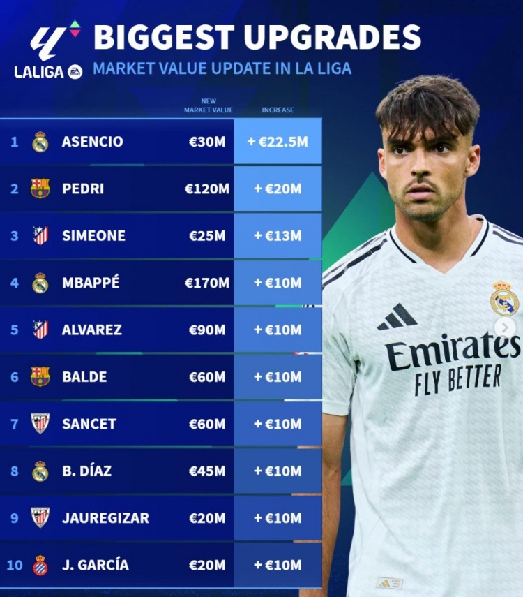 3月24日讯 《转会市场》统计了西甲球员身价更新后的升值最多情况,劳尔-阿森西奥力压佩德里居首。